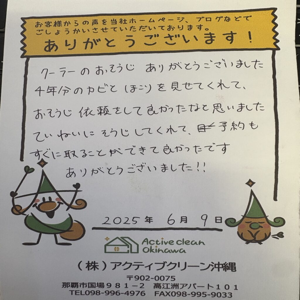 お客様の声 2025年10月16日 投稿者: activeclean クーラーのおそうじありがとうございました 4年分のカビとほこりを見せてくれて、おそうじ依頼をして良かったなと思いました ていねいにそうじしてくれて、予約もすぐに取ることができてよかったです ありがとうございました!! 前の記事お客様の声